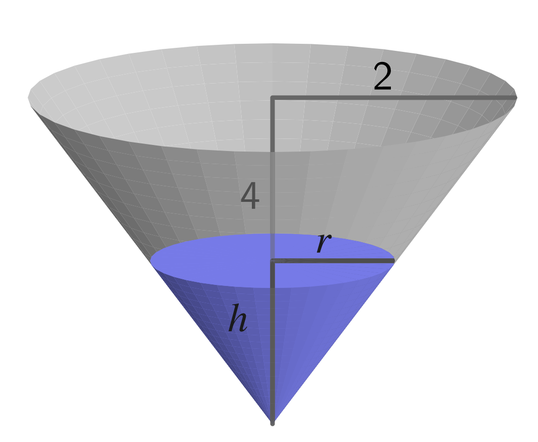FigureΒ 1.1.43 depicts a water tank in the shape of a circular cone (with tip pointed downward). The height of the tank is 4 meters, and its circular top has a radius of 2 meters. The tank contains an initial quantity of water that steadily drains through a regulated valve at the bottom.