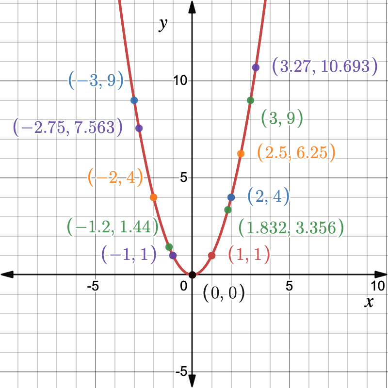 For example, starting with the table of values of \(f(x)=x^2\) in (b) of FigureΒ 1.1.26 and adding a few additional input/out pairs (e.g., \((2.5, f(2.5))=(2.5, 6.25)\)), we are able to produce a convincing graph of \(f\text{.}\)