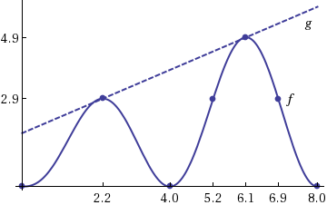Based on the graphs of \(f(x)\) and \(g(x)\) below, answer the following questions. If a question has more than one answer, fill in your answer as a list of values separated by commas. Thus for example if you think \(f(x) = g(x)\) when \(x = 20\text{,}\) when \(x = 25\text{,}\) and when \(x = 29\text{,}\) you would enter 20, 25, 29 (or any other order of these three numbers separated by commas).
