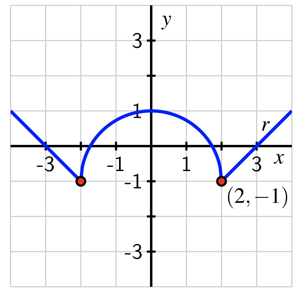 Consider the function \(r\) given in FigureΒ 1.6.17 below. Describe in words how the function \(m(x) = 2r(x+1)-1\) is the result of three transformations of \(r(x)\text{.}\) Does the order in which these transformations occur matter? Why or why not?
