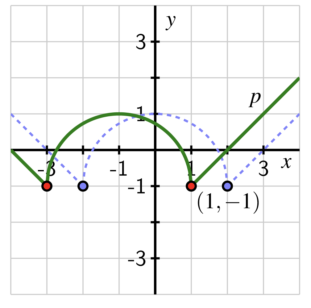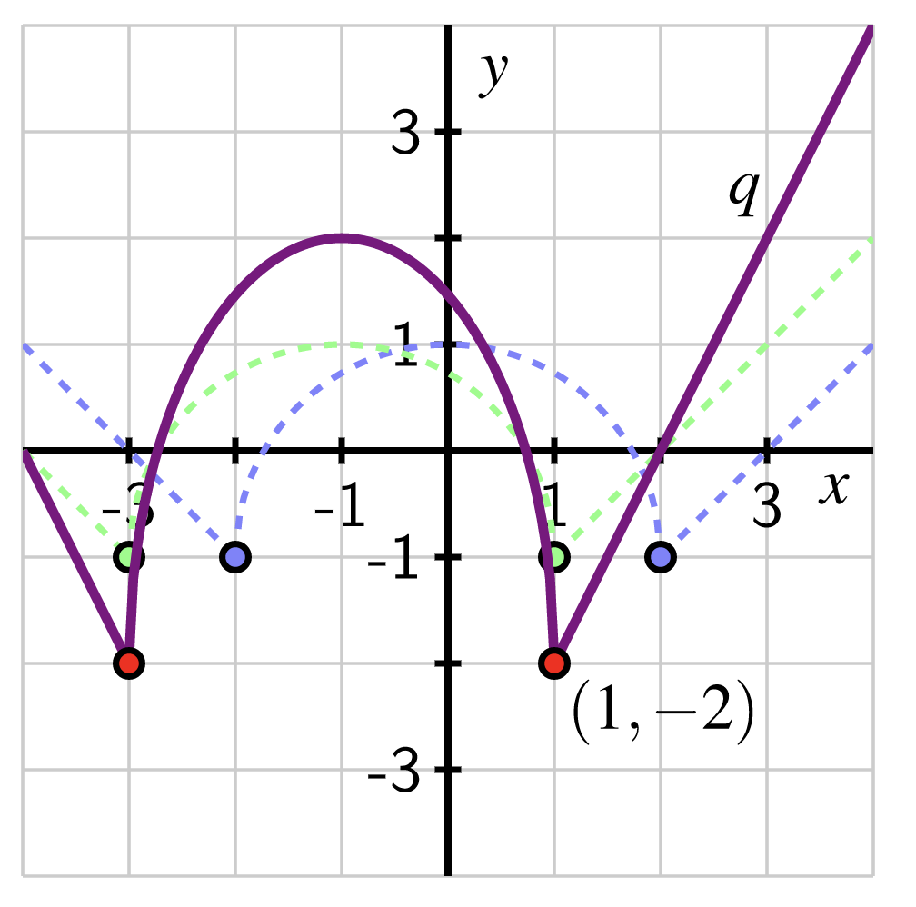 In FigureΒ 1.6.18, we see the function that results from a shift of 1 unit left of the function \(y=r(x)\) in FigureΒ 1.6.17. The tracked point first moves left 1 unit to \((1,-1)\text{.}\) (Each time we take an additional step, we will de-emphasize the preceding function by having it appear in lighter color and dashed.)