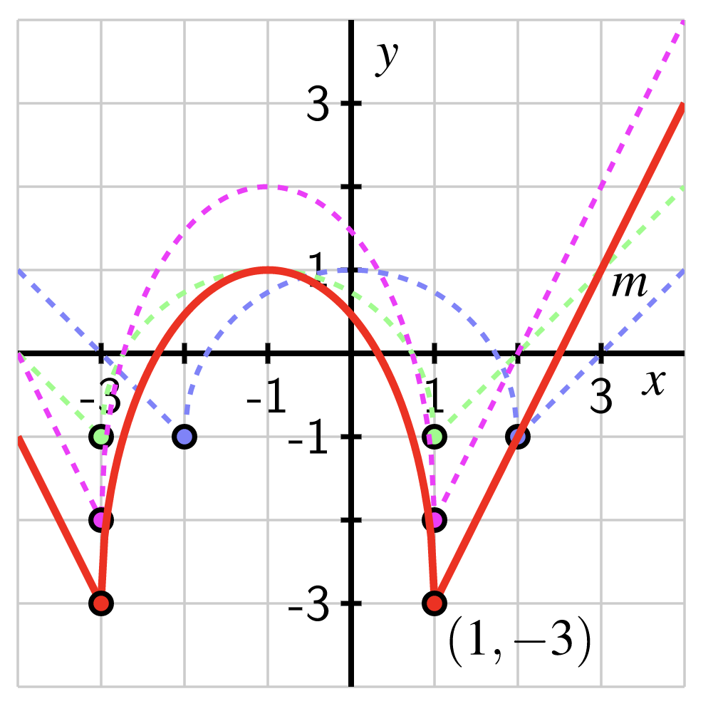 Finally, we arrive at \(y=2r(x+1)-1\) by subtracting 1 from the previous graph; this of course is a vertical shift of \(-1\) units, and produces the graph of \(m\) shown in red in FigureΒ 1.6.20. The tracked point is shifted 1 unit down to the point \((1,-3)\text{.}\)