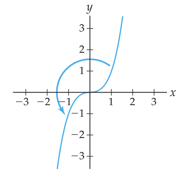 As another example, the graph of \(g(x) = x^3\) shown in FigureΒ 1.6.23 below remains the same if we reflect it first across the \(y\)-axis and then across the \(x\)-axis. This double-reflection across the \(x\)- and \(y\)-axis is equivalent to rotation around the origin by \(180^\circ\text{.}\) Take a moment to experiment with this: on a piece of scrap paper, draw a smiley face or some other picture. Flip the paper vertically and then horizontally (or horizontally and then vertically). This gives you the same result as rotating the paper by 180 degrees. A function that is preserved under the transformation of \(180^\circ\) rotation is said to have \(180^\circ\)rotational symmetry.