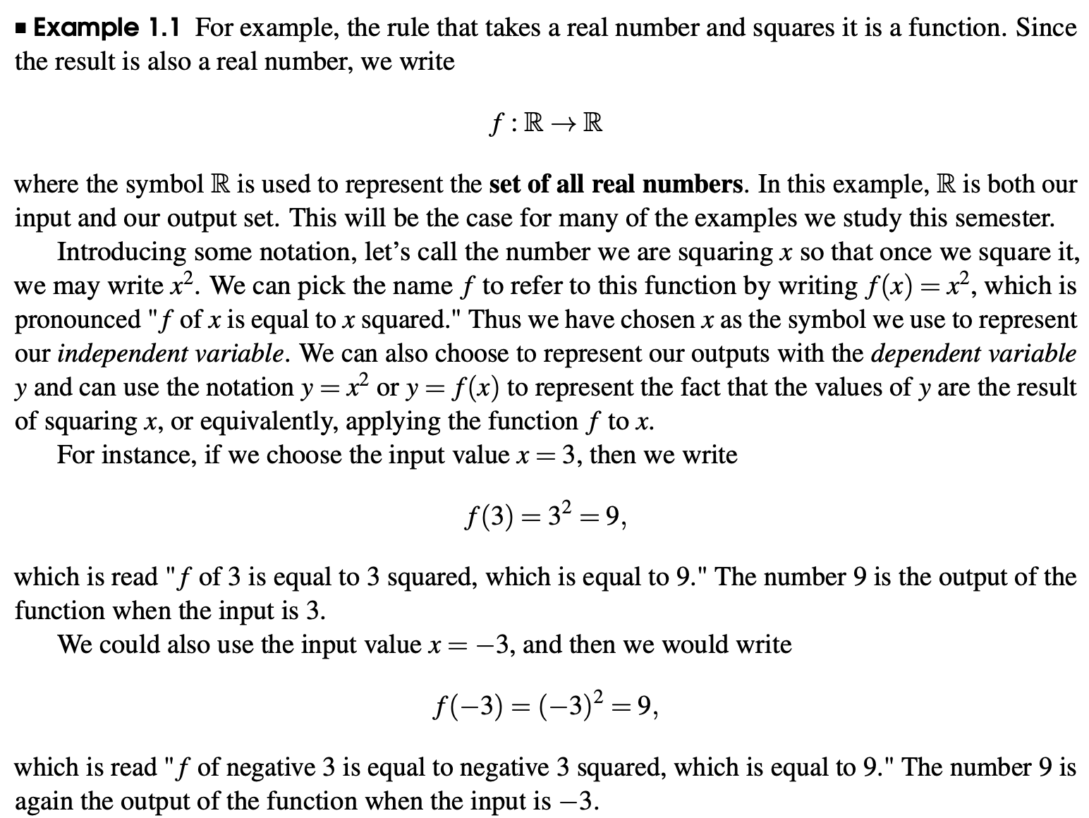 Example 1.1 follows immediately after Definition 1.1 in the text and illustrates the idea of a function introduced there, as well as the terms independent and dependent variable. It also introduces a new symbol and its meaning, the set \(\mathbb{R}\) of all real numbers. If Definition 1.1 did not make sense to you when you read it earlier, return to it and compare it with this example to see how the abstracted ideas in the definition are made more concrete in this example.