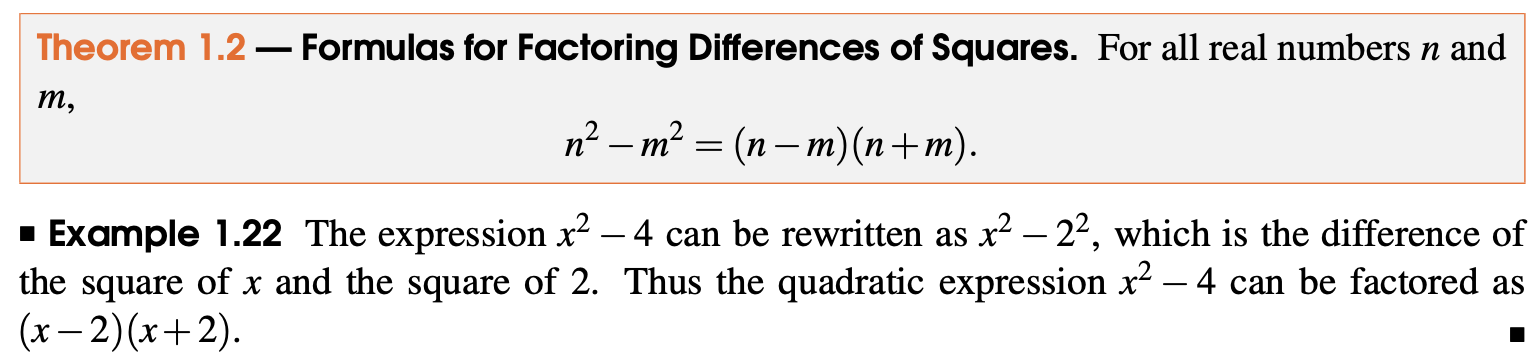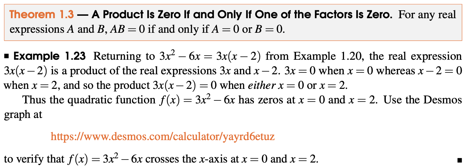 Example 1.23 follows Theorem 1.3 in the text as shown. It begins with an expression that was factored in a previous example, and demonstrates how the property of multiplication in Theorem 1.3 allows us to set each of the factored expressions equal to zero and solve in order to determine where the full expression is equal to zero. The example goes on to contextualize the calculation graphically and provides a clickable link to a Desmos graph (you should always click on these as you are reading) in order to verify that the algebraic work is correct. A "non-example" is typically an example of something that does not fit a mathematical idea.