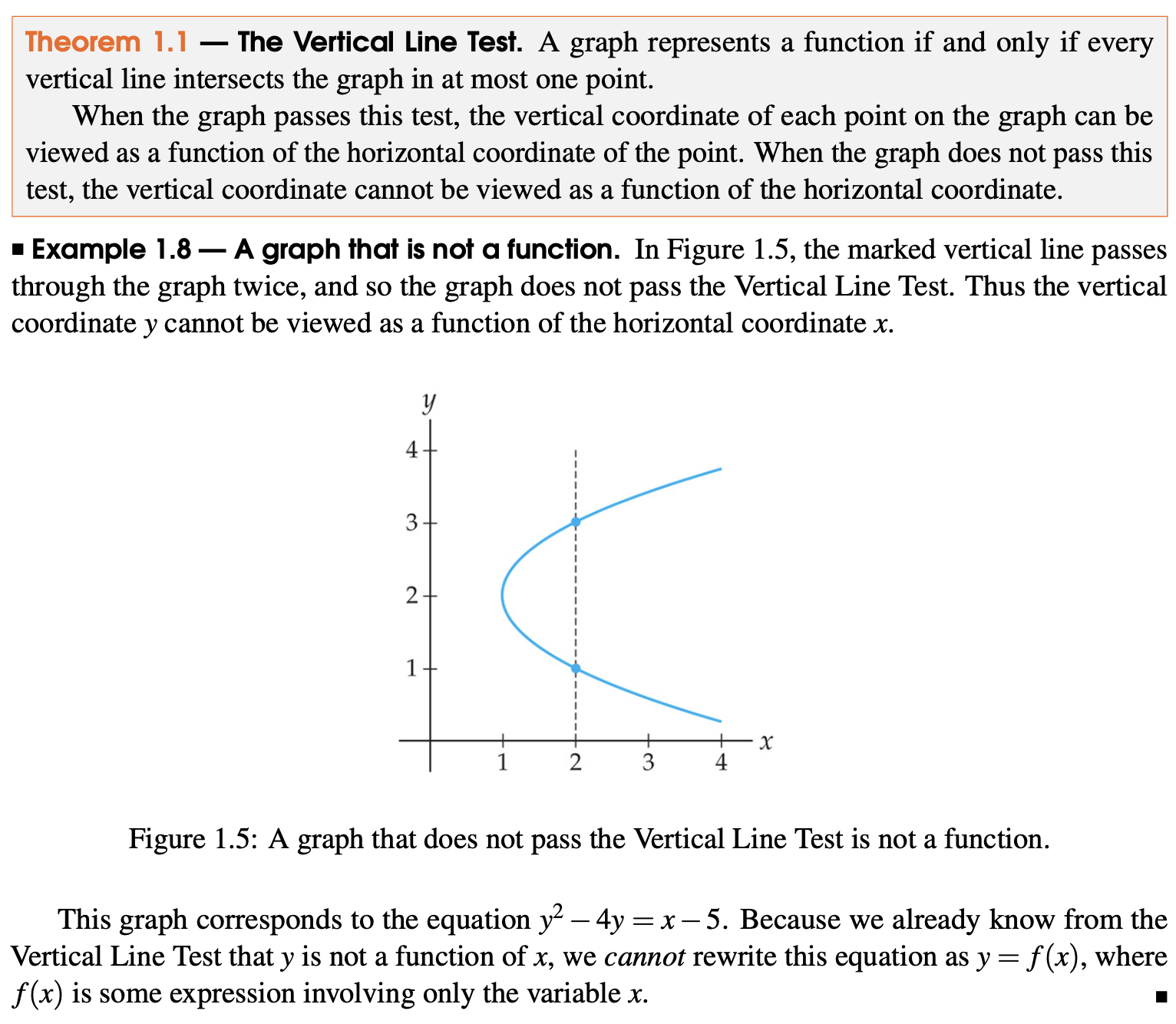 Example 1.8 illustrates how Theorem 1.1, the Vertical Line Test, is applied, and also provides an example of a graph that is NOT a function, meaning a "non-example" of a function. Non-examples are often just as enlightening as examples, if not more-so, because they show the limitations of the mathematical idea.