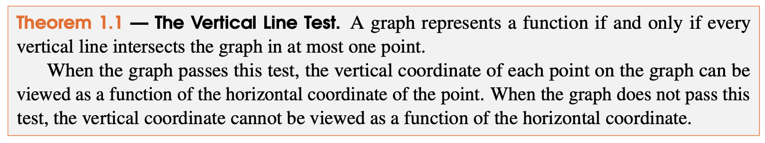 Theorem 1.1 is a "classification" and gives a visual condition that categorizes a graph as either a function or not a function. The theorem also has a name by which it is commonly referred: the Vertical Line Test. Names of theorems often serve to remind us of their contents, though sometimes they refer to the person who discovered the theorem.