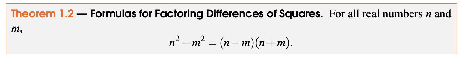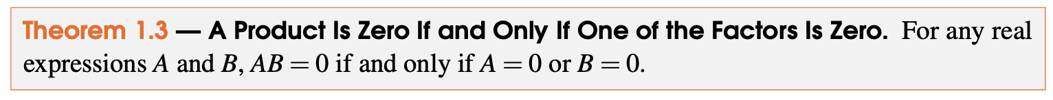 Theorem 1.3 tells us a mathematical "fact" about products of numbers or expressions that are equal to zero. This is a very important property that relies on the theoretical structure of real numbers and real-valued functions. Theorem 1.3 is also the connection between the algebraic method of factoring and the task of solving an equation. Whenever you see a theorem, you should add it to you notes and take extra special care that you understand the purpose and meaning of the theorem. Because this course will not focus on mathematical proofs (logical arguments that explain rigorously why a theorem is true), you may or may not fully understand why a theorem is always true. The text should provide enough examples to suggest why it is true, or you could come up with a few more examples on your own if you are not yet convinced.