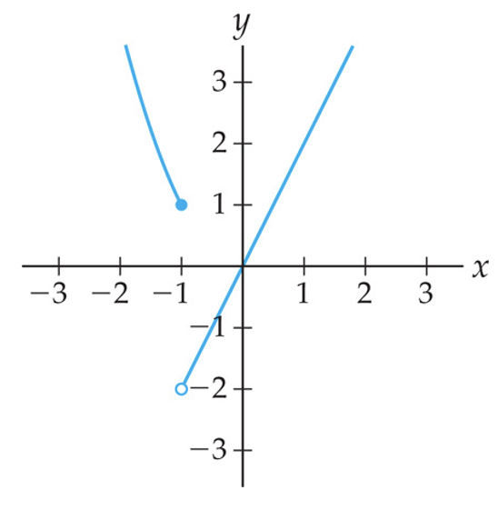 To graph \(f\) we graph the function \(g(x)=x^2\) on the domain \((-\infty, -1]\) and the function \(h(x)=2x\) on the domain \((-1,\infty)\text{.}\) Note that we must be careful about the value of \(f\) at the cutoff input \(x=-1\text{.}\) Since this value is included in the first case of the definition, we have \(f(-1)=(-1)^2=1\text{,}\) corresponding to the point \(P=(-1,1)\) on the graph below.